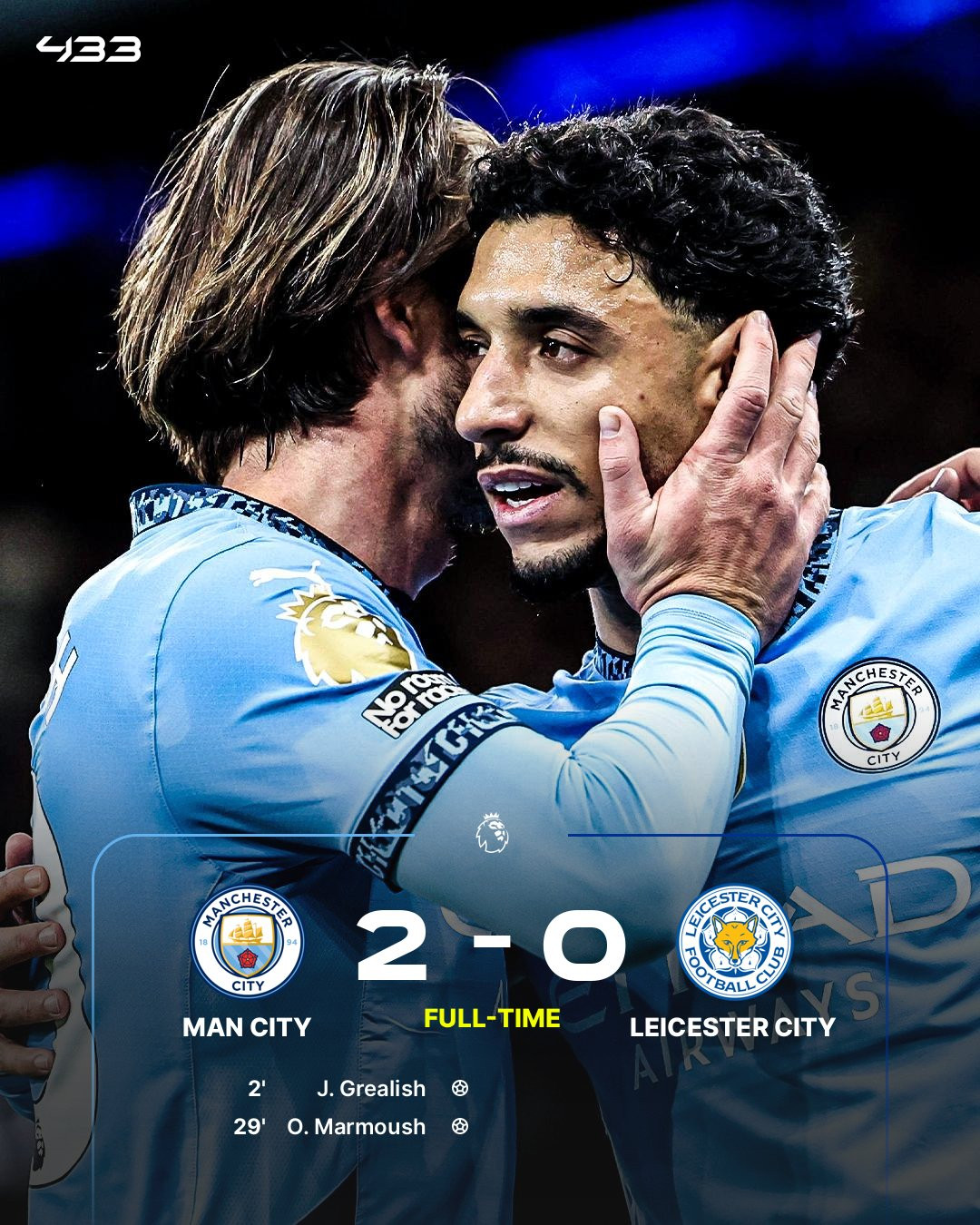Jack Grealish cùng Omar Marmoush thay nhau ghi bàn giúp Man City đánh bại Leicester 2-0, trong ngày Haaland vắng mặt vì chấn thương.